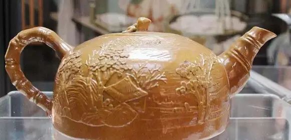 (清)王新荣 褐釉雕山水纹壶 「王新荣作」印-大约清代道光年间(1821-1850年间)