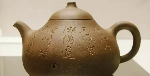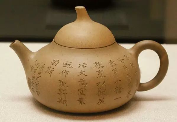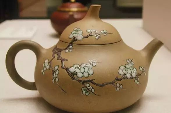 (清)瞿应绍 仿曼生粉彩梅枝刻铭壶 「吉安(瞿应绍)」;「定郡清赏(载铨)」印, 「行有恒堂主人(载铨)制」刻款,「道光己酉」(1849年)年刻。 高:9.1厘米,阔:10.8厘米。